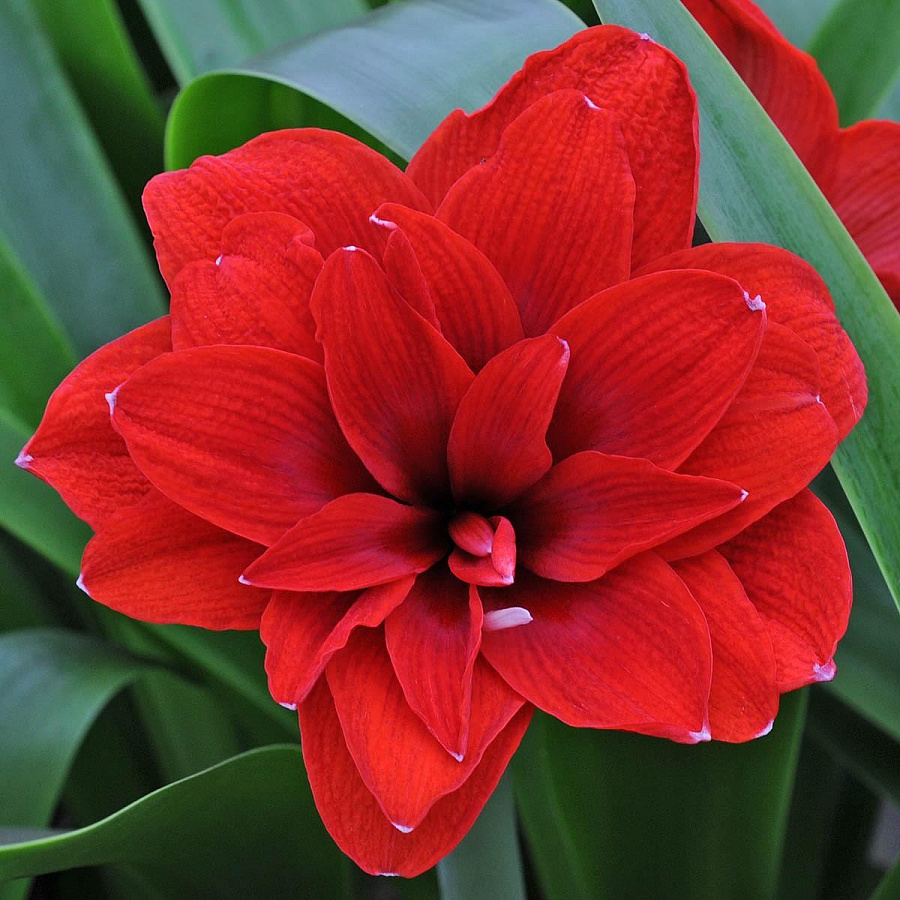 Луковицы Амариллиса гибридного Дабл Драгон (Double Dragon) образуют цветы удивительной красоты: на мощном цветоносе раскрываются до 5 огромных, многослойных бутонов ярко-алого цвета с белыми искорками на кончиках листьев. Диаметр раскрытого цветка достигает 20 сантиметров. Широкие остроконечные лепестки расположены в несколько рядов, придавая цветку дополнительный объем.