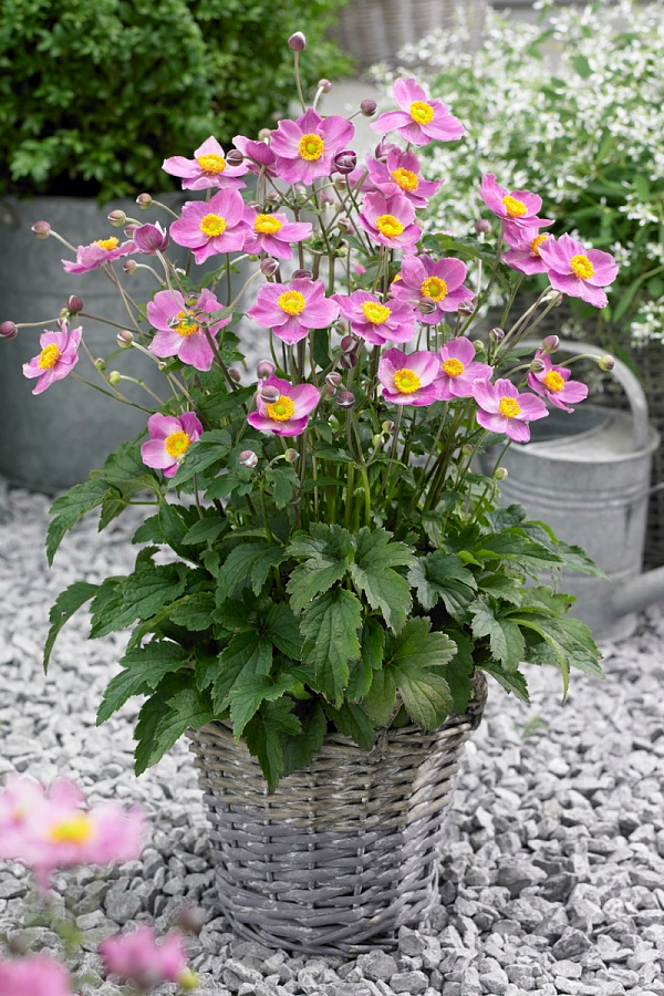 Рассада анемоны Фэнтези цидерелла (Fantasy ciderella) вырастает компактным, аккуратным кустиком около 60 см в высоту. Листва крупная, широкая, трехлопастная и темно-зеленого тона. Цветет розовыми, пятилепестковыми цветочками с желтой серединкой, которые располагаются на длинных побегах. Достоинства анемоны Фентези цидерелла: