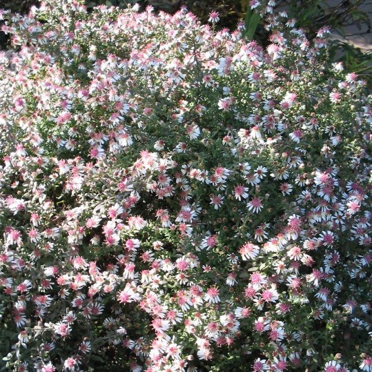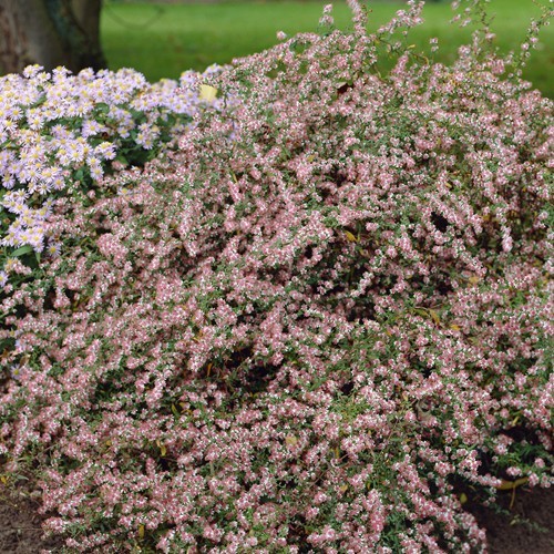 Астра бокоцветная Horizontalis цветет с сентября до ноябрьских заморозков. Во время цветения кусты покрываются многочисленными цветами с бело-розовыми лепестками. Высота взрослого растения достигает 150 сантиметров.