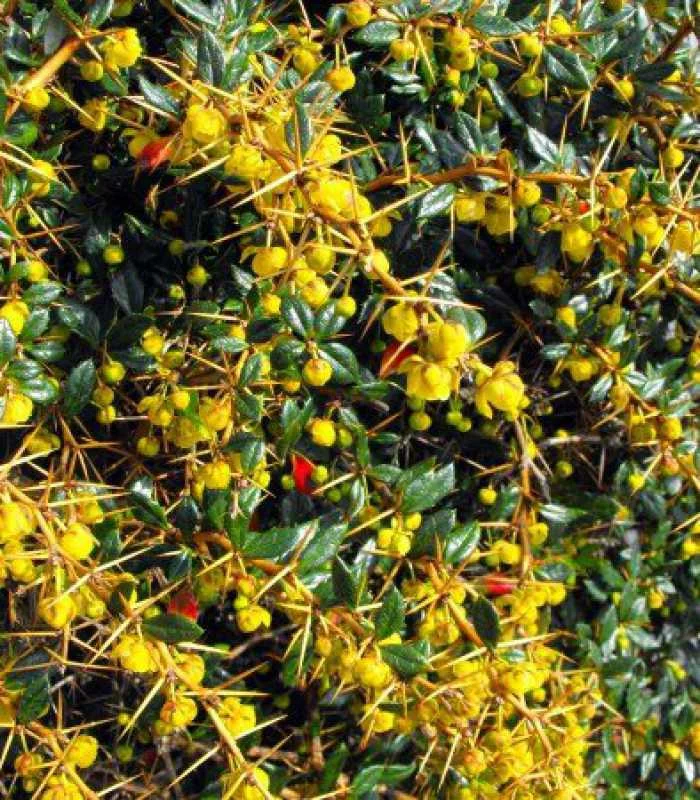 Саженцы барбариса бородавчатого (Berberis verruculosa) не спеша, выпростают в колючий, раскидистый кустик около 1-1,5 м в высоту. Стебли густо покрыты листвой и бородавками. Листики продолговатой формы, немного подогнутые в серединку, темно-зеленого тона. Цветет яркими, золотисто-желтыми цветочками в июне-июле. Цветение одиночное и обильное. Достоинства барбариса бородавчатого: