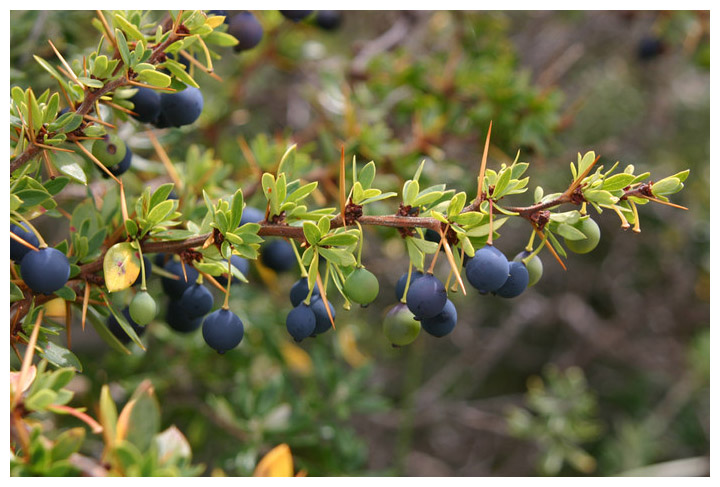 Плоды барбариса бородавчатого имеют яйцевидную, продолговатую форму и насыщено-синий окрас. Ягоды собраны в небольшие, рыхлые кисти.