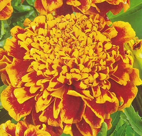 Бархатцы отклоненные махровые двухцветный гигант - это великолепное растение с темно-красными цветками, которые привлекают внимание своей красотой и изысканностью. Высота этого растения может достигать до 30 см, а диаметр цветка составляет 5-6 см. Листья бархатцев имеют интересную форму и насыщенный зеленый цвет, что делает растение еще более привлекательным.
