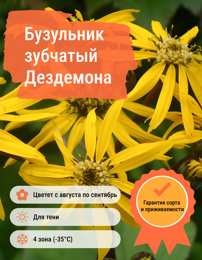 Рассада бузульника зубчатого Дездемона (Desdemona) сочетает в себе отличные адаптационные свойства и прекрасные декоративные качества. Популярность сорт заслужил своими особенностями: крупные листья зеленого цвета с бронзовым оттенком и отчетливо выраженными свекольными жилками снизу (частично сверху); обильным и длительным цветением ярко-желтыми цветками; устойчивостью к садовым болезням. Семенами бузульник зубчатый Дездемона размножается также хорошо, как и рассадой. Но стоит помнить, что в таком случае, куст зацветает через несколько лет. Широко применяется данный сорт для озеленения приусадебных участков, в композициях с декоративно-лиственными культурами, а также солитерно.