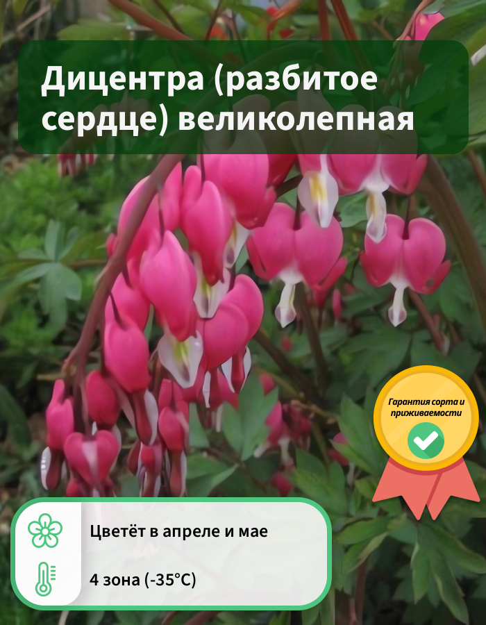 Рассада Дицентра великолепная отличается своей неприхотливостью и способностью украсить любой садовый участок своими изящными цветками и листьями, похожими на папоротник. Этот сорт вырастает до 1 метра в высоту. Стебли Дицентры мясистые и прямостоячие, а корни длинные и мощные. Листочки наверху темно-зеленого цвета, который в нижней части переходит в серо-дымчатый. Благодаря красивым листьям даже, когда период цветения заканчивается, растение не утрачивает декоративности. Всё, что нужно делать для ухода за рассадой – разместить её на почве с хорошим дренированием, удобрять небольшим количеством органических или азотных компонентов, осуществлять регулярный полив. В затененном месте сорт будет цвести немного дольше.