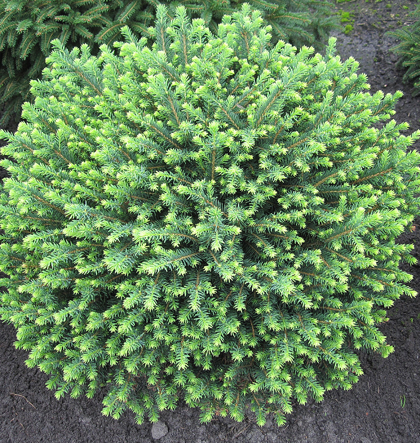 Саженцы ели Сербской Карел (Karel) невысокие кустарники, напоминающие зеленый хвойный клубок, любимый сорт садоводов за декоративность и компактность. Пушистая крона сформирована из раскидистых скелетных ветвей с нежно-зелеными хвоинками, расположенными в 2 ряда. Высота крупномера не больше 60-80 см, диаметр достигает 1м. Годовой прирост медленный, всего 3-5 см.