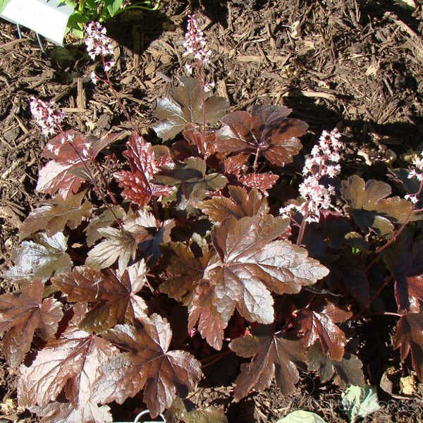 Рассада гейхереллы Барнишед Бронз (Burnished Bronze) украсит ваш сад необычными бронзовыми листьями с глянцевой поверхностью. В конце весны кусты расцветают, выпуская высокие цветоносы с нежными бело-розовыми цветочками. Этот сорт часто используют для декорирования клумб, мест отдыха и каменных горок. Многолетник хорошо смотрится вместе с розами, геранями и другими декоративными растениями.