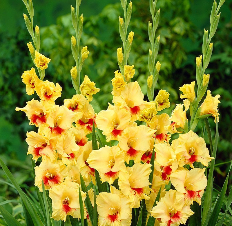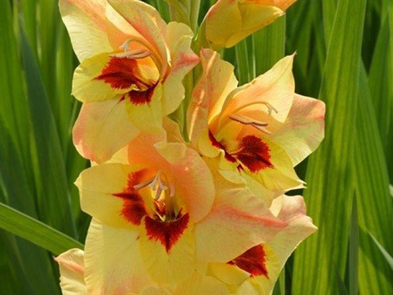 Гладиолус Бамбино Бочелли - это великолепное растение, которое поразит вас своей изысканной красотой. Его кремово-желтые цветки с вишневым пятном в центре привлекут внимание всех окружающих. Растение имеет стебель высотой от 60 до 90 см, что делает его идеальным для создания ярких цветочных композиций в саду или на клумбе.