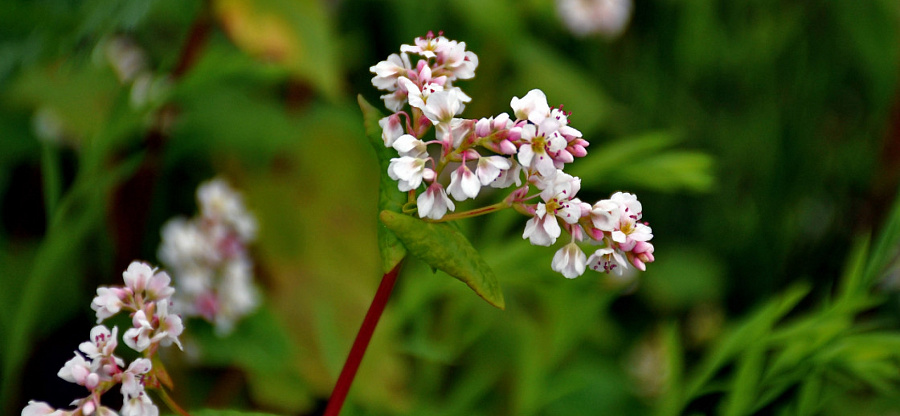 Семена гречихи обыкновенной принадлежат к медоносным сортам культур, которые дают много нектара и зеленовато-жёлтой пыльцы. Рост зеленой массы продолжается почти до созревания. Бутоны начинают формироваться спустя 8-10дней, после прорастания семян гречихи обыкновенной. Цветение длится 35-40дней. Стебель растения прямостоячий, розовый, высотой от 25 до 50 см. Листья стрелосердцевидные, заостренные. Цветы розовой или белой окраски, собираются кистями, а на верхушке стебля образуют щитковидное соцветие. Обладают сильным ароматом. Плоды гречихи – трехгранные орешки, различной формы и окраски.