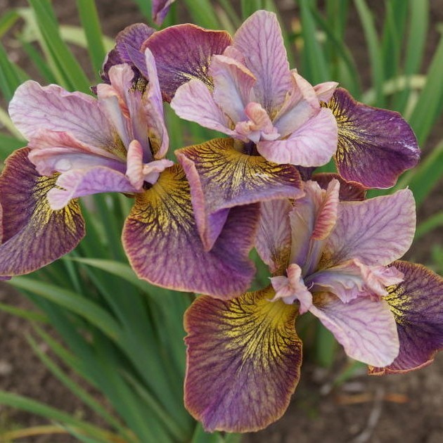 Окраска цветка : фиолетовые с жёлтым жилкованием у основания, центр — палево-розовый с сиреневыми прожилками