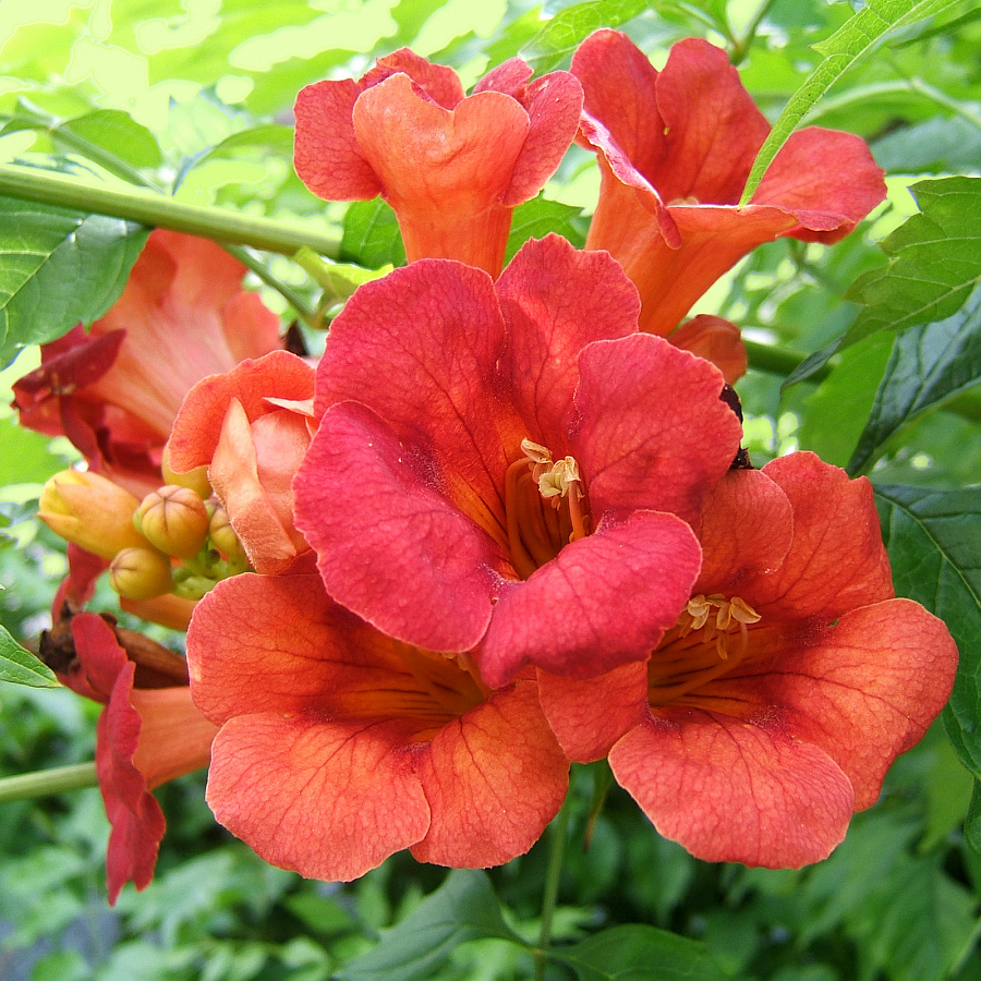 Кампсис укореняющийся урсинов - это великолепное растение с оранжевыми цветками, которое поразит вас своей красотой и изяществом. Его ствол прочный и устойчивый, а размеры растения позволяют ему стать настоящим украшением вашего сада или огорода. Листья кампсиса имеют необычную форму, что делает его еще более привлекательным.