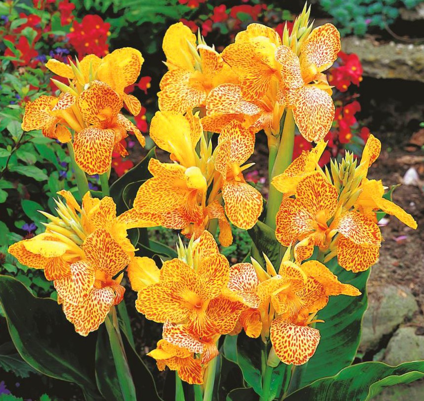 Луковицы Канны гибридной Эн Авант (Canna En Avant) стоит купить на свой дачный участок или для зонирования придомовой части загородного дома. Крупное декоративное растения (до 1 метра в высоту) с крепким стеблем и вытянутыми красивыми листьями (до 60 сантиметров), покоряет изобилием неповторимых (огромных до 13 сантиметров), соцветий желтого цвета с красноватым крапом. Желтая Канна радует цветами с лета до поздней осени, любит много солнца. Она нуждается в обильном поливе и подкормке, на зимовку выкапывается с земляным комом, размножается делением корня. Нежные желтые цветы преобразят любой уголок сада, даже самый невзрачный.