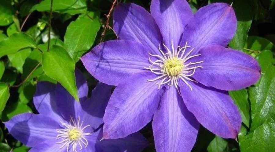 Клематис гибридный Х.Ф. Янг (H.F Young) умеренно растущий, морозоустойчивый не требует укрытия на зиму. Цветки голубой окраски, простые или полумахровые 12,5-15 см в диаметре.