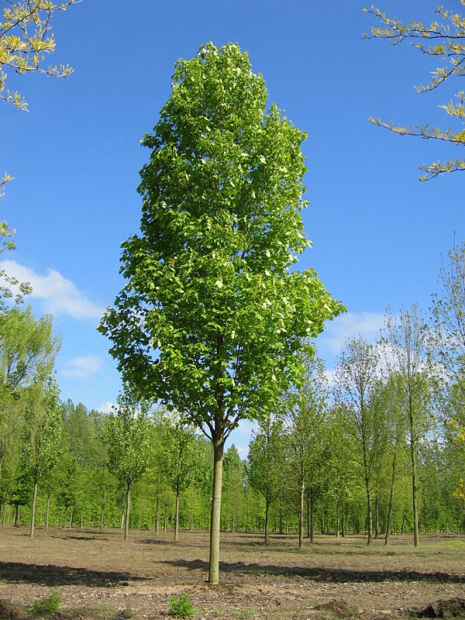 Саженцы клёна красного Сканлон (Scanlon) хорошо подходит для озеленения разных территорий, высадки вокруг водоёмов. Крона до 10-12 м высотой и 3-4 м в диаметре, узкоколоновидной формы. Листья весной имеют красноватый оттенок, летом зелёные с беловато-сизым окрасом изнанки, к листопаду окрас меняется на жёлто-оранжевый или почти красный с оттенками. Морозоустойчивость высокая, но при холодных ветрах возможно обмерзание молодых побегов. Хорошо выносит городские условия. При необходимости возможно приобретение крупномеров клёна красного Сканлон. Болезненно воспринимает сухой грунт и воздух — в засушливые периоды рекомендуется полив и дождевание кроны. Не переносит уплотнение почвы.