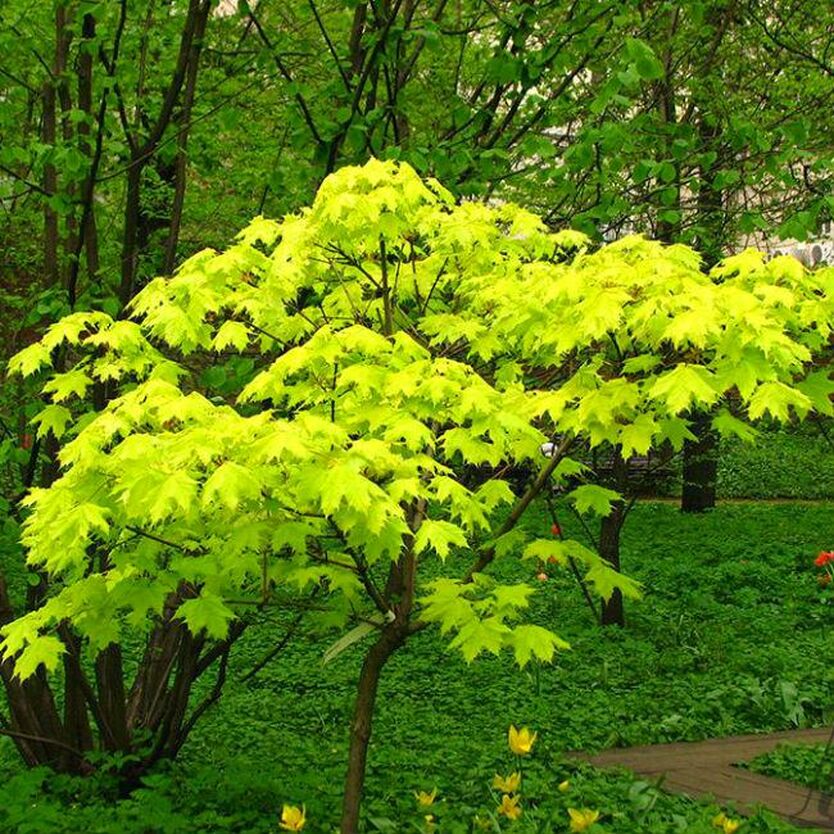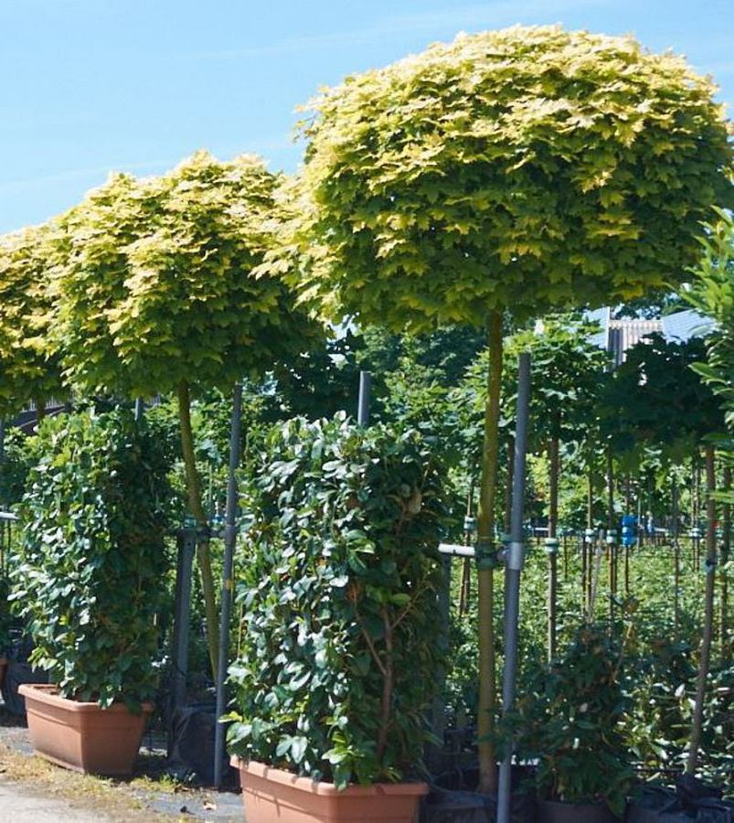 Крупномеры клена остролистного "Голден Глоб" к почве нетребовательны, но предпочитают плодородную, рыхлую, достаточно увлажненную землю. Дерево не выносит пересушенный грунт и застойной влаги. Крупномеры клена остролистного "Голден Глоб" морозоустойчивы, но в сильно суровые зимы могут повреждаться побеги. В высоту дерево достигает до 4-6 метров. Крона округлая диаметром до 5 метров. Листья весной яркой оранжево-красной расцветки. Если дерево растет на солнечном месте, летом листва приобретает золотисто-желтый оттенок, а при посадке в тени – светло-зеленый. Цветы собираются в желто-зеленые соцветия.