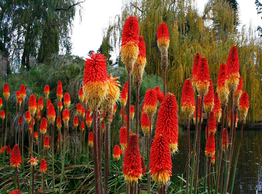 Рассада Книфофии ягодной очень разнообразна: у каждого вида свой цвет соцветий. У книфофии толстый корень. Листья длинные, расположены около корня. Цветы маленькие, собранные в густые соцветия-колоски. Имеется цветонос. Цветёт всё лето и в начале осени. Сначала цветут нижние цветки, а потом постепенно цветут верхние. Плод книфофии ягодной — коробочка, в которой находятся семена.