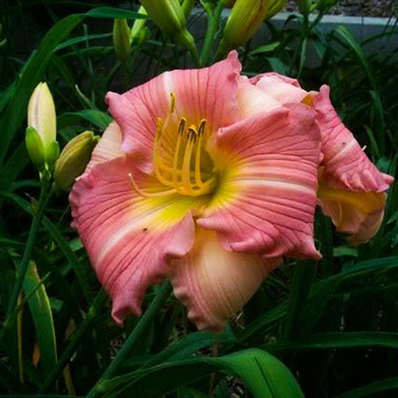 Рассада лилейника Чайна Брайд (China Bride) – многолетнее травянистое растение, вырастающее до 60 см. Обладает двухцветными цветками – их внешние лепестки светло-розового оттенка, а внутренние лепестки – ярко розовые с кремовой центральной полосой. Сердцевина желтая, а по краям цветки гофрированные. Растение начинает цвести уже в июле, и размер цветов достигает диаметра 11 см. Сорт Чайна Брайд хорошо растет на солнечных полянах, а вот в тени ухудшается цветение. Данный сорт будет лучше ощущать себя на хорошо дренированной почве, при умеренном поступлении влаги к корням. Неплохо вырастает на глинистом грунте, но землю вокруг цветка рекомендуется часто разрыхлять. При не морозной зиме рассада может перезимовать без дополнительного укрытия.