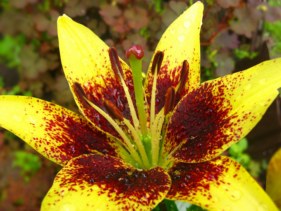 Окраска цветка : жёлтый с тёмно-коричневым крапом, сгущающийся к центру