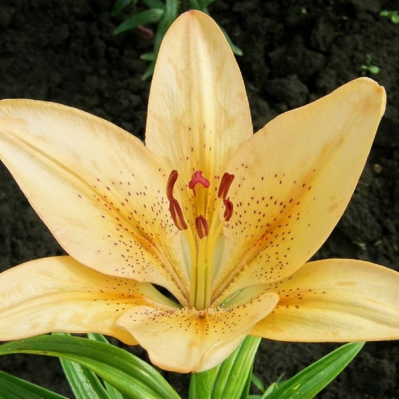 Саженцы и рассада лилии ла-гибрид Боллрум (Lilium) не будут выделяться в саду или на клумбе, спрятавшись за своим спокойным внешним видом. Боллрум - среднерослое растение со стеблем, не вырастающим выше 1 метра. Листва густая, зеленая, без глянца. Цветонос состоит из нескольких цветков традиционного оттенка крем-брюлле. Более темная полоса внутри лепестков и коричневые вкрапления гармонично дополняют классические формы.
