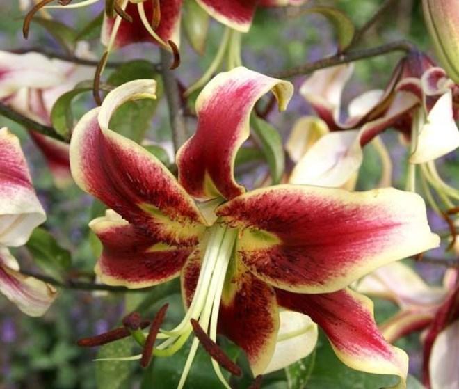 Саженцы и рассада от-гибридной Лилии Шехерезада (Lilium OT-hybrid Scheherazade) предназначены для высадки эффектного и ароматного растения, которое может похвалиться крупными цветками на высоком плотном стебле. Широко открытые лепестки с отогнутыми и волнистыми краями желтого цвета с темно-красной серединой и коричневыми пыльниками преображаются в кремово-белые оттенки в области горловины. Этот экзотический сорт, перед весенней посадкой которого луковицы обрабатывают в слабом растворе марганцовки, предпочитает рыхлые хорошо дренированные почвы. Зимоустойчивая Шехерезада не требует укрытия, а выкопав ее на зиму поместите в опилки на нижнюю полку подвального помещения.