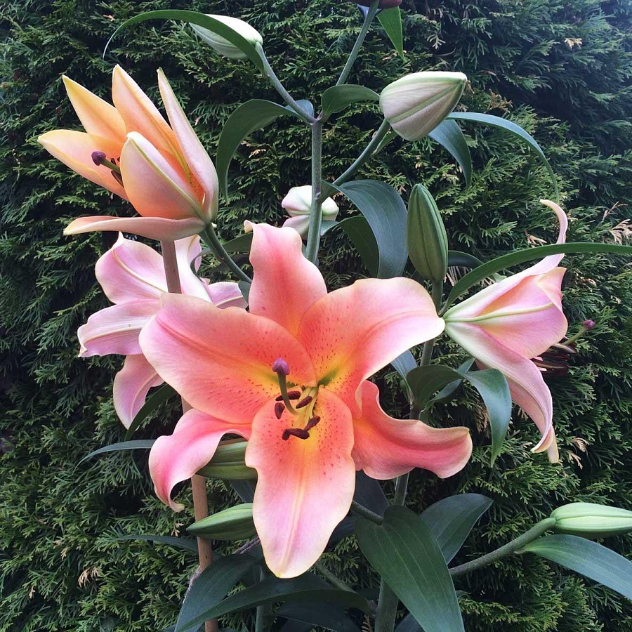 Очень красивая Лилия. Уже в июле на высоких цветоносах (до 120 см) появляется одновременно много цветков (на отдельных кустах — до 30 штук), которые достигают 25 см в диаметре. Лепестки матовые, окрашены в светлый персиковый оттенок с плавным переходом к яркому лососевому в центре. Цвет классический и создает правильные акценты в композициях, но не менее эффектно смотрится и в отдельности. Лилия Зелмира — один из самых популярных и узнаваемых сортов. Он особенно ценится благодаря простоте в уходе. Цветы могут расти на одном месте до 4–5 лет в условиях регулярного добавления минеральных подкормок. На зиму растение нуждается в укрытии и хорошо переносит морозы в открытом грунте.
