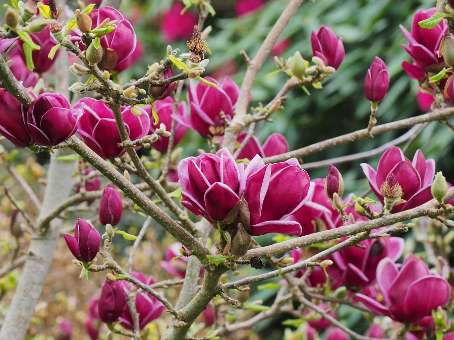 Саженцы магнолии гибридной Джени (Genie) вырастают в эффектные деревья, цветущие темно-рубиновыми цветками. Взрослый куст имеет коническую форму кроны и вырастает в 3-4 м высоты. Бутоны похожие на тюльпаны, распускаются в крупные круглые цветки диаметром почти 15 см. Растения очень ветвистые и больше похожи на кусты, с компактной кроной и плотным ветвлением. Зацветает магнолия гибридная Джени в конце апреля или в мае.