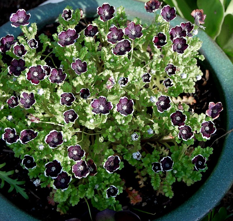 Семена немофилы обыкновенной (Nemophila menziesii) Пенни блек, высаженные в апреле, дадут вам цветущий с июня по сентябрь удивительный по красоте экзотичный коврик.  Все дело в необычной окраске цветков этого сорта — лепестки имеют почти черный цвет и белую кайму по краям. Цветы одиночные, мелкие, около 3 сантиметров в диаметре. Листья удлиненные, перистые. Стебли стелющиеся, до 15 сантиметров высотой. Чтобы получить плотную полянку цветов и зелени, семена следует высаживать на расстоянии 10-20 сантиметров друг от друга. Немофила предпочитает полутень и влажный грунт. Выигрышно смотрится в рабатках, бордюрах, горшечных композициях.