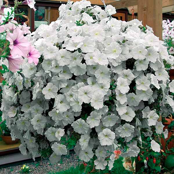 Петуния каскадная Рэмблин Вайт обладает белыми цветами, которые расцветают в мае, июне и июле, принося радость и свежесть в ваше пространство. Это растение предпочитает солнечные места и плодородные почвы, поэтому выберите для него яркое место под открытым небом.