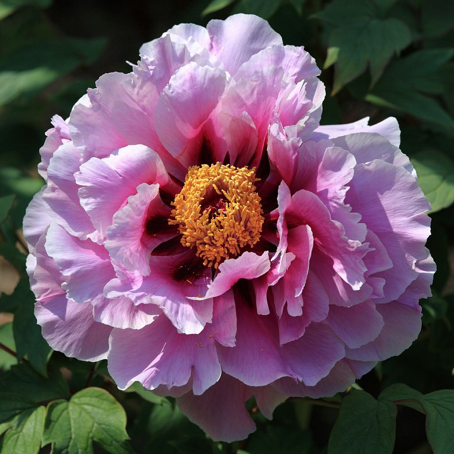 Пион древовидный Голубой лотос - цветки розово-голубого цвета, 20 см в диаметре. Куст сильнорослый, 120-150 см высотой. Морозоустойчивый кустарник, достигающий высоты до 2 м, с крупными ярко-зелеными листьями. На одном кусте может быть от 30 до 70 цветков. Диаметр каждого от 20 до 25 см. Продолжительность цветения 12—14 дней. Растение декоративно и после цветения из-за необычной формы листьев. Пион неприхотлив, устойчив к болезням. На одном месте без пересадки может расти более 20 лет.