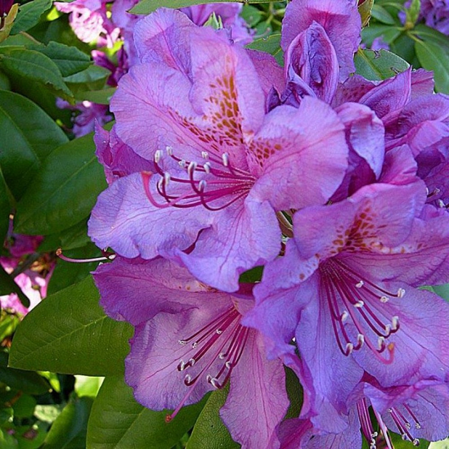 Рододендрон гибридный Лиз Дак Пёпл - это великолепное растение с темно-пурпурными цветками и желто-коричневым пятном, которое поразит ваш воображение своей красотой. Сорт lees dark purple обладает высотой до 180 см, что делает его идеальным для создания живых изгородей или групповых посадок на газоне. Листья зеленого цвета сохраняют свою красоту в течение всего сезона, а размер цветка до 5 см добавляет неповторимый шарм этому растению.