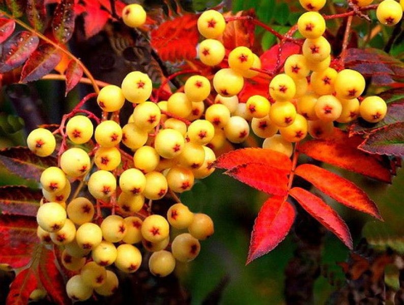 Листочки крупные, как и у всех рябин имеют форму пера. После цветения завязываются ягоды, их можно собирать в сентябре и октябре. В отличие от других представителей у плодов нет привычной терпкости. Как привило, из ягод делают заготовки и сушат.
