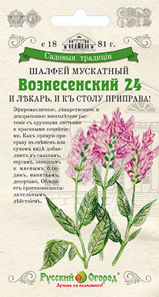 Семена шалфея "Вознесенский 24" высевают под зиму или ранней весной. Растение не переносит возвратных весенних заморозков, поэтому его необходимо укрывать в этот период. Сорт шалфея "Вознесенский 24" светолюбив, засухоустойчив и теплолюбив, к почвам нетребователен. Высота растения до 90-100 см. Цветки крупные розово-фиолетового цвета, собранные в метельчатое соцветие. Листья большие (длина и ширина 10-15 см), опушенные, серо-зеленые. Их заготавливают до цветения и используют в качестве пряной приправы. Вся надземная часть, собранная во время цветения, употребляется для лечебных ванн при болезнях суставов.