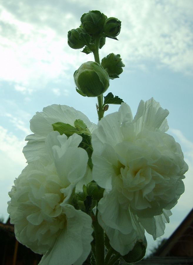 Шток-роза белая - это изысканное растение с великолепными белыми цветками, которые напоминают нежные облака на голубом небе. Ее ствол прочный и прямой, достигает высоты до 200 см, что делает ее идеальным украшением для вашего сада или огорода. Листья этого растения имеют форму ланцета и создают уютную зеленую атмосферу вокруг.