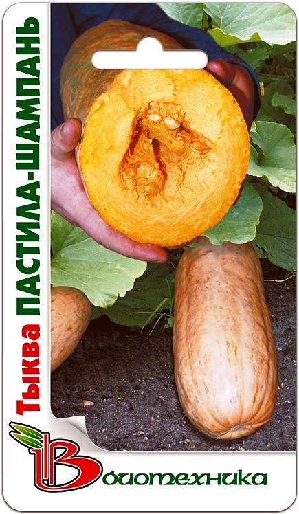 Семена тыквы "Пастила Шампань" (Pastila Shampan) – сорт, который высевают сразу на постоянное место. Посев осуществляют в мае – июне. Дружное созревание плодов происходит в середине августа сентябре. Урожай отличается вытянутой эллипсовидной формой. Кожица розового цвета с небольшими зелеными полосками. Кора средней толщины. Мякоть ярко-оранжевая, ароматная, плотная, хрустящая. Средняя масса плода около 2-3 кг. Сорт подходит для употребления в свежем виде и различной переработки. Урожай отличается хорошей лежкостью без потери товарных качеств.