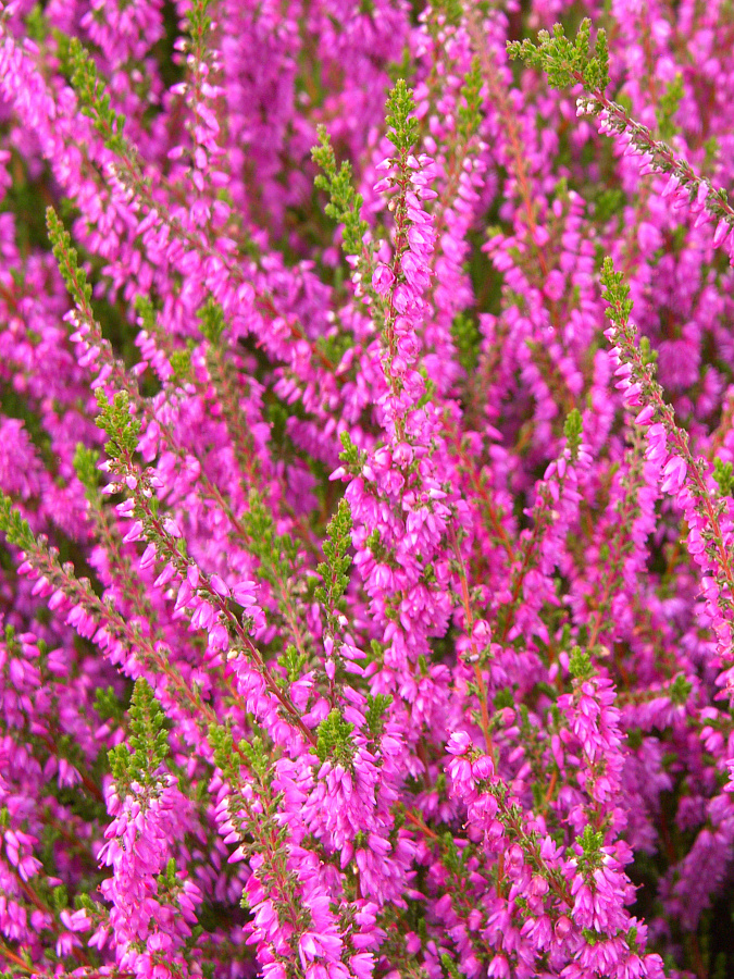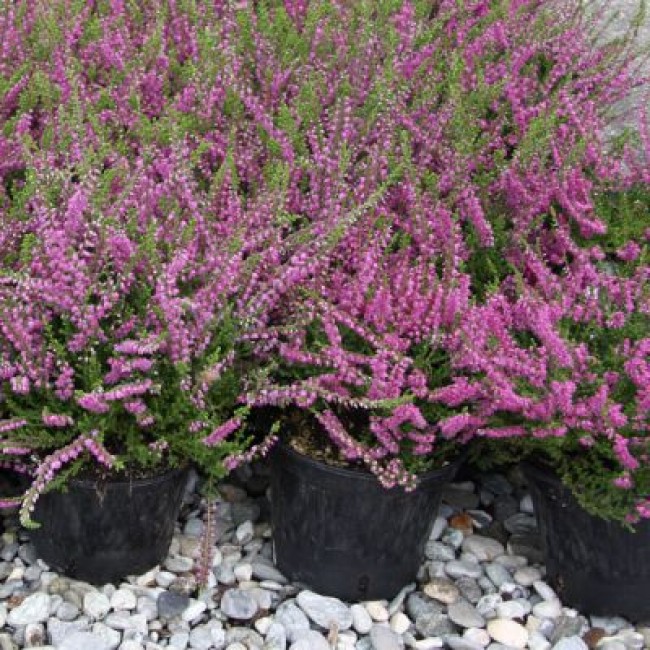 Саженцы вереска обыкновенного Кармен (Carmen) создают эффектный низкий кустик с очень густой подушкообразной кроной. Побеги, длиной 40 сантиметров, растут вверх и в стороны. Листва мелкая, темно-зеленая, она служит удачным обрамлением длинным густым сиреневым соцветиям. Цветет вереск 2 месяца, начиная с августа.
