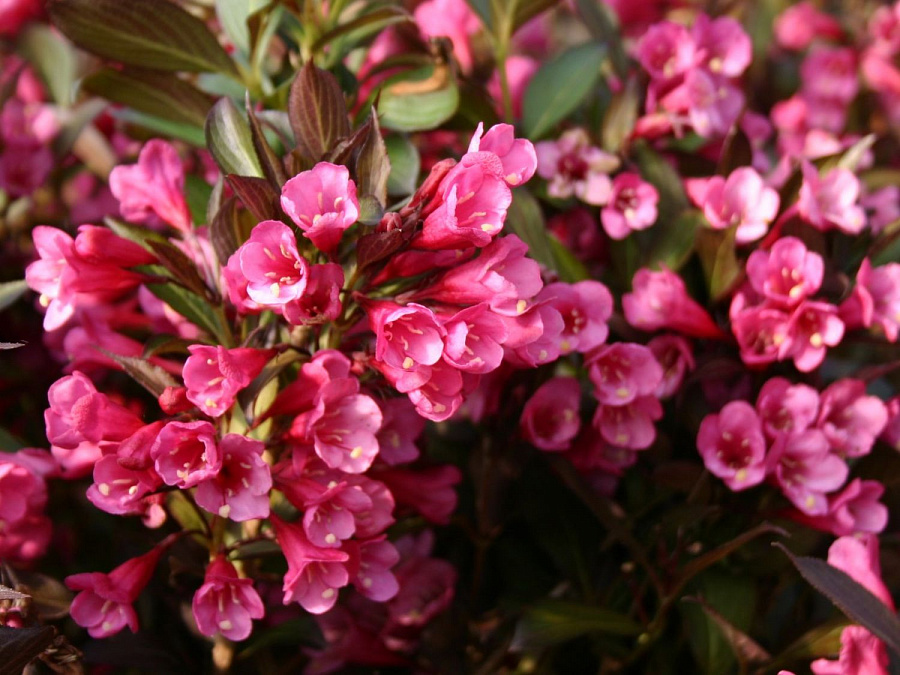 Саженцы вейгелы цветущей Александра (Alexandra) подарят саду декоративный лиственный кустарник с густой кроной шаровидной формы. Сорт очень популярен благодаря сочетанию ярких красно-розовых воронковидных цветочков с бордовой листвой. Обильное цветение приходится на июль, но в меньшем количестве привлекательные цветки могут появляться до сентября.